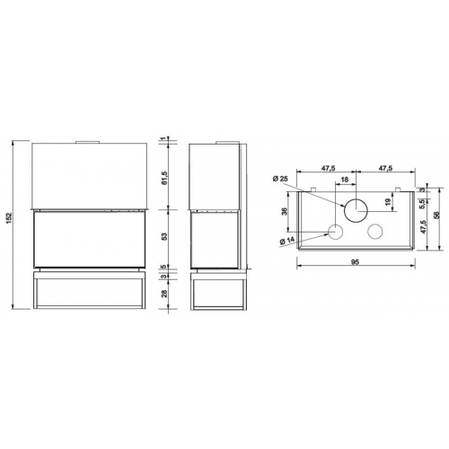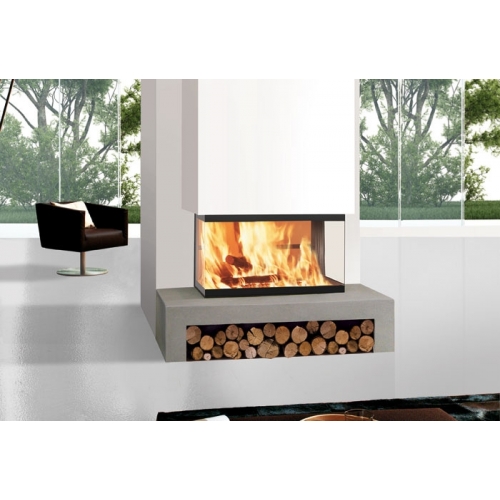 Трехсторонняя топка с 3 стеклянными элементами и обширным обзором огня, с очагом из огнеупорного материала, циркуляцией горячего воздуха посредством естественной конвекции.