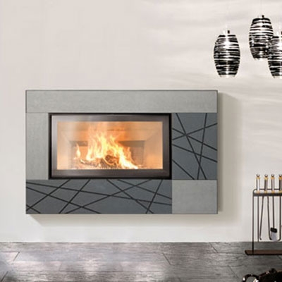 Каминная металлическая рамка в современном стиле из камня Pietra Serena и черного стонелита с декоративным геометрическим дизайном.
