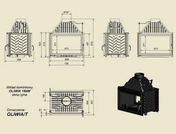 Oliwia/T - каминная топка из чугуна, выдерживающего высокотемпературный режим. Изготовлена компанией KRATKI (Польша). Необычный дизайн (двустороннее сквозное остекление) позволяет использовать ее в островных каминах или печах, отапливающих две комнаты. Корпус покрыт сетью дополнительных ребер, увеличивающих полезную площадь теплоотдачи. Каминное топливо - сухие дрова. Материал окон - термостойкая стеклокерамика, с температурным порогом в 800 градусов Цельсия. Дверца топки открывается вбок.