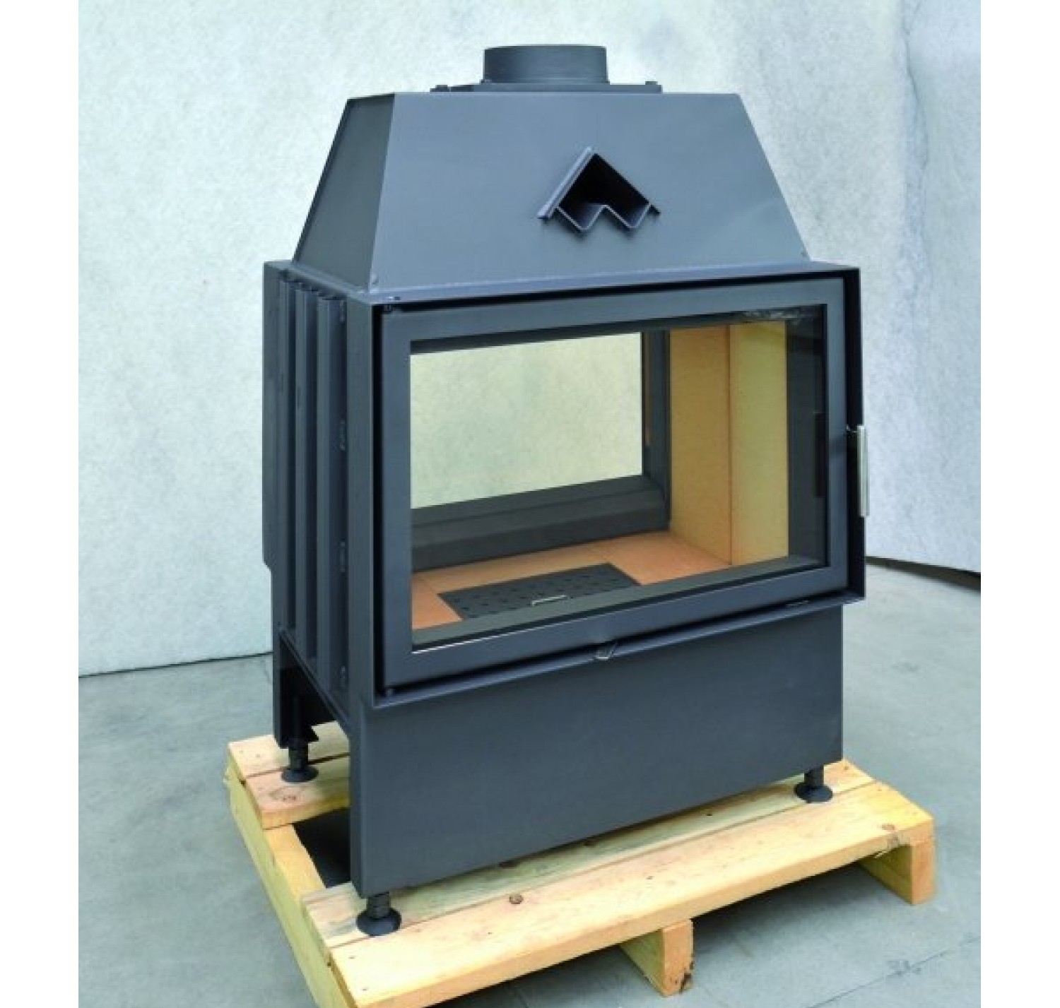 Корпус каминной топки выполнен из жаропрочной стали, колосники и патрубки из чугуна.